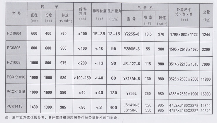 PC型锤式破碎机适用于破碎脆性、中硬的、表面水分不超过2%、抗压强度不超过150Mpa的各种物料。广泛应用于煤炭、冶金、建材、电力、化工等部门中碎或细碎煤、煤矸石、石灰石、页岩、长石、石膏、焦炭、砖瓦、碎石、盐及硫、磷、褐铁矿石等。该破碎机分为可逆和不可逆两种,可逆式的转子可以逆转,一般用于细碎。不可逆式的转子不可以逆转,一般用于中碎。一段锤破为不可逆式。