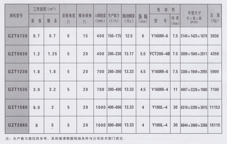 GZT系列棒条式振动给料机共有五个规格,适用于破碎机前大块物料的均匀给料。特别适合于黑色或有色金属矿石、建筑石料粗碎前的给料用:该系列给料机,由于在接近排料端的给料面布有分级作用缝隙可调的棒条,所以在进行给料同时能将物料中泥土及细碎粒级的物料分离出去,使其后面的破碎机更有效地发挥功能;该系列给料机是引进消化美国技术制造的振动器、框架式环槽铆钉联接结构,又采用锰钢制造的护板和棒条,结构坚固、强度高、耐冲击、耐磨损。
