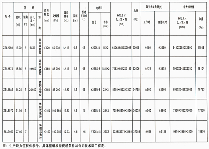 ZSL系列冷矿振动筛共有五种规格,适合于冶金部门对温度在150℃以下松散的烧结矿料进行分级,该系列振动筛采用振动器重心偏移式自同步或强迫同步结构,运动轨迹近似为直线,有二次隔振的减振系统。