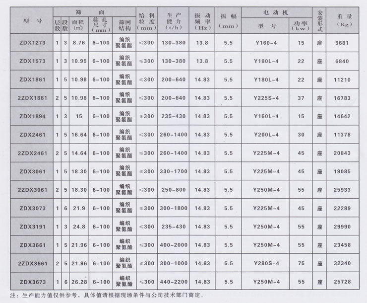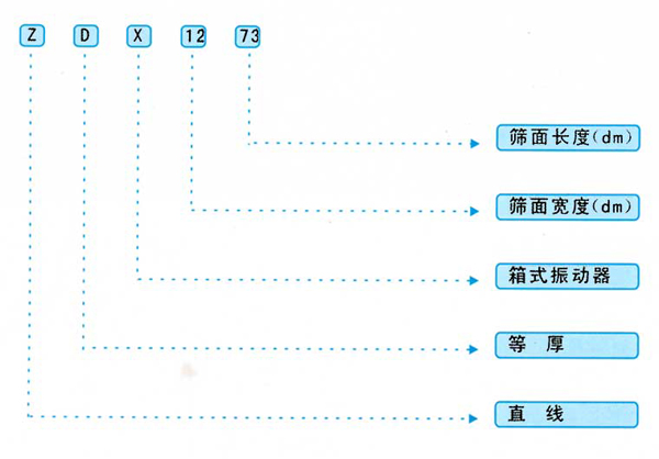 A、用途: ZDX系列等厚振动筛的运动轨迹为直线。筛机可为煤炭、焦碳、矿石、沙砾或其它中小颗粒的物料进行干、湿式分级。 B、订货须知及特点: 该筛筛面选用不同倾角的数段筛板首尾相接,筛面纵向断面成折线形式,从而保证入料端到排料端各处筛面上的物料厚度几乎一致,使筛分效率显著提高,对中、细颗粒的煤分级效果更佳,处理量与同规格的一般惯性振动筛相比可提高1—2倍。 C、型号含义: