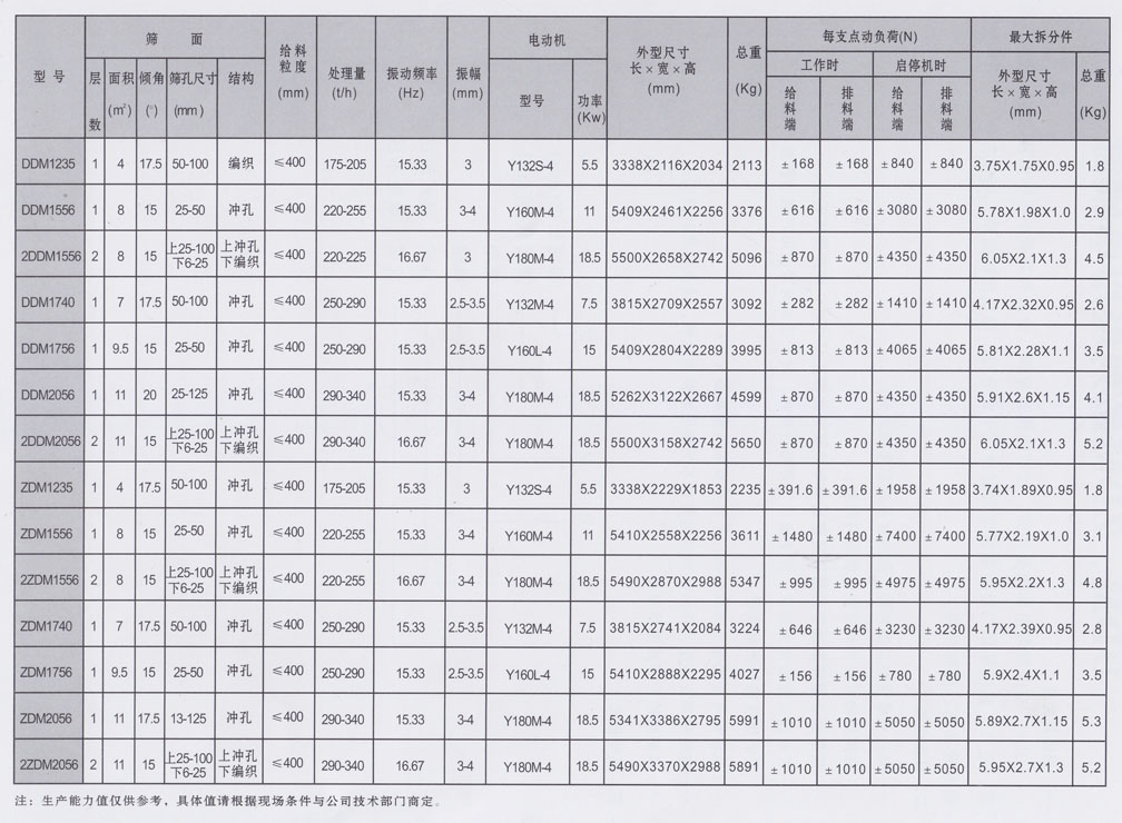 DDM、ZDM型煤用单轴振动筛,运动轴迹为圆,全系列共有十四种规格,可供选煤、选矿、电力、建筑等部门对中等粒度物料进行干式分级。筛机结构简单、维修方便、作业可靠,筛分效率高,透筛性好。