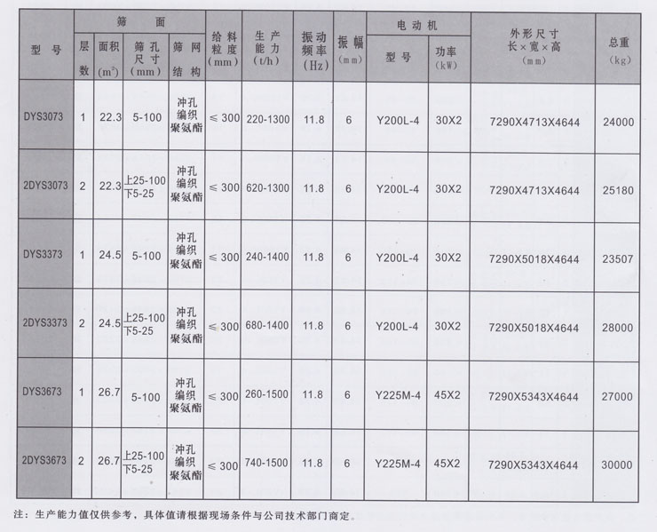DYS系列大型圆振动筛的运动轨迹为圆,该系列共有六种规格。可供选煤、选矿、建材、电力及化工行业作物料干式分级用。筛机是在消化、吸收美国先进筛机YA系列圆振动筛技术的基础上研制成功的。在双电机驱动的两轴之间由于通过齿形皮带联接使两轴运转保持了同步性。当编织筛孔尺寸小于25mm时,筛网下面设有振打球。