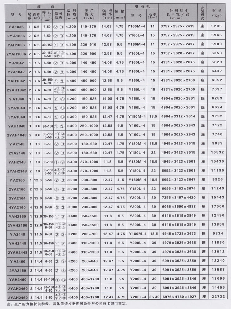 YA系列圆振动筛运动轨迹为圆,该系列共有四十种规格,可供选煤、选矿、建材、电力及化工等部门作物料干式分级。该系列筛机引进美国技术制造,采用环槽铆钉冷铆联接框架式结构,大游隙轴承稀油润滑的振动器。